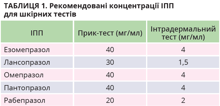 Рекомендовані концентрації ІПП для шкірних тестів представлено в таблиці 1. Якщо прик-тест негативний, інтрадермальний тест проводити не потрібно. Останній застосовується лише для ін’єкційних форм ІПП.