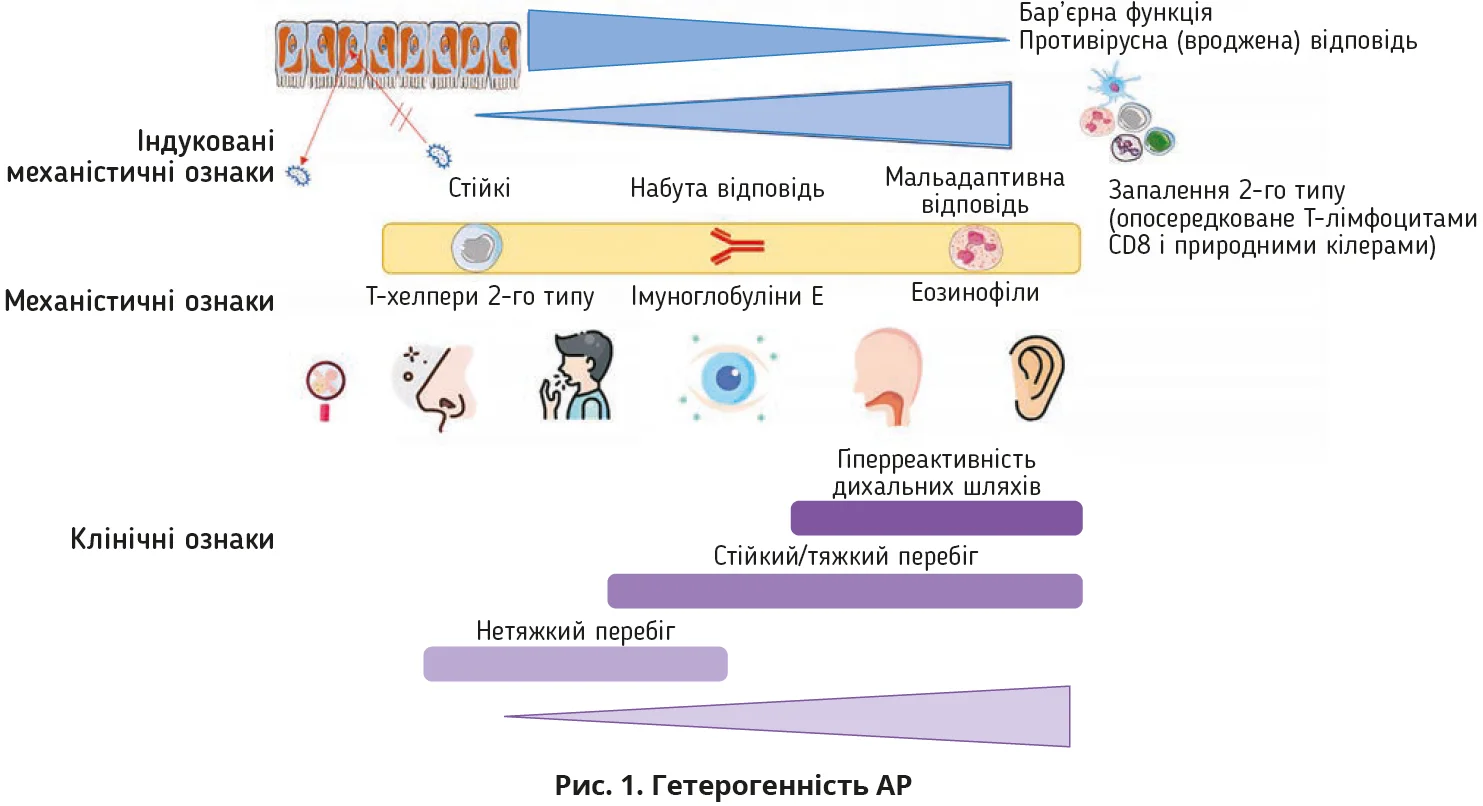 У пацієнтів з АР спостерігається гетерогенна клінічна картина, яка включає моно- або полісенсибілізацію, риніт різної тяжкості та різнопланові коморбідності (рис. 1). Зміни в класичній клінічній картині АР спричинили також зміна клімату й асоційовані з нею зміни сезонів цвітіння. Посилювати або провокувати симптоми АР можуть і неспецифічні подразники на кшталт забруднення повітря. У зв’язку з переліченими чинниками Ініціатива «АР і його вплив на астму» (ARIA) запропонувала класифікацію на САР і ЦАР замінити класифікацією на інтермітивний (ІАР) і персистивний АР (ПАР). При ІАР симптоми тривають менш ніж 4 дні на тиждень або менш ніж 4 тижні поспіль, а при ПАР – понад 4 дні на тиждень і понад 4 тижні поспіль.