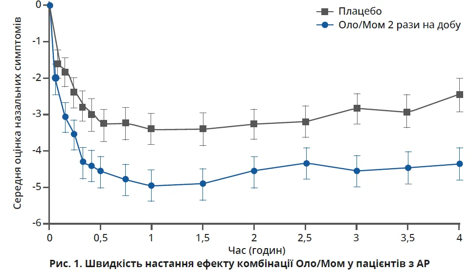 Ефект комбінації Оло/Мом (Ріалтріс) настає дуже швидко. За даними F.C. Hampel і співавт. (2019), він розвивається вже через 15 хвилин після вприскування, а в дослідженні P. Patel і співавт. (2019) описано ще швидше покращення сумарної оцінки назальних симптомів у разі застосування назального спрею Оло/Мом, а саме через 10 хвилин після вприскування (рис. 1).