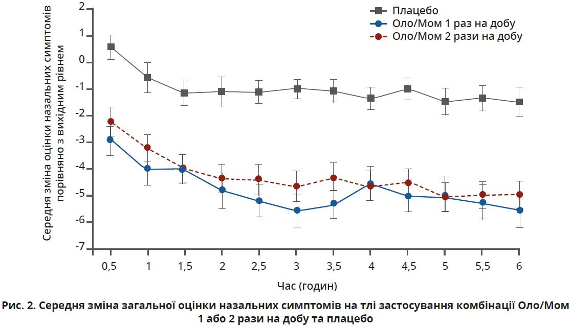 Одним з наріжних каменів доказової бази фіксованої комбінації Оло/Мом є дослідження P. Patel і співавт. (2019), у якому пацієнтів з АР рандомізували в групи цієї комбінації 1 або 2 рази на добу та плацебо. Застосування Оло/Мом сприяло статистично достовірному покращенню оцінки за iTNSS порівняно з плацебо (для Оло/Мом 2 рази на добу середня відмінність становила −3,60 бала; 95% довірчий інтервал [ДІ] – від −4,89 до −2,30; для Оло/Мом 1 раз на добу середня відмінність становила −3,05 бала; 95% ДІ – від −4,35 до −1,76; р<0,0001 в обох випадках) (рис. 2).
