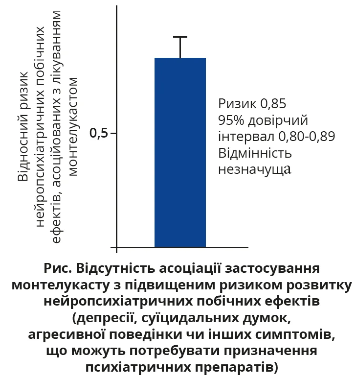Наймасштабніше на сьогодні дослідження на підставі даних реєстрів охоплювало майже 30 тисяч пацієнтів і відстежувало їхній стан здоров’я протягом 1 року до початку й 1 року після початку терапії монтелукастом. Було встановлено, що поширеність нейропсихіатричних подій залишалася стабільною в обох періодах. Отже, монтелукаст не може бути безпосередньо пов’язаний з розвитком клінічно значущих нейропсихіатричних ефектів (рис.).