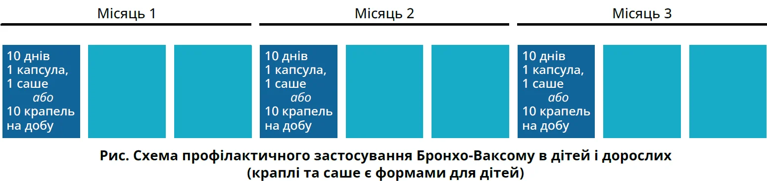 Профілактичне лікування OM-85 (рис.) можна розпочинати в будь-який час, але пацієнтам групи ризику його варто призначати до періоду сезону респіраторних інфекцій (наприклад, рано восени або перед весною) (Esposito S. et al., 2014, 2022). За потреби профілактичне лікування можна повторювати. Важливо, що профілактичне лікування OM-85 може бути розпочато під час гострої фази респіраторних інфекцій у поєднанні з іншими методами лікування. Було показано, що прийом OM-85, розпочатий у гострій фазі інфекції, зменшує частоту подальших інфекцій у дітей і дорослих (Zagar S., Lofler-Badzek D., 1988; Gómez Barreto D. et al., 1988; Soler M. et al., 2007).