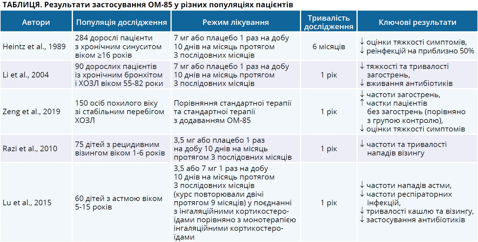 У численних рандомізованих контрольованих дослідженнях за участю осіб віком від 1 до 82 років імунна відповідь після 3 місяців застосування OM-85 спостерігалася протягом близько 9 місяців. Узагальнені результати цих досліджень представлено в таблиці (Heintz B. et al., 1989; Li J. et al., 2004; Zeng D. et al., 2019; Razi C.H. et al., 2010; Lu Y. et al., 2015).