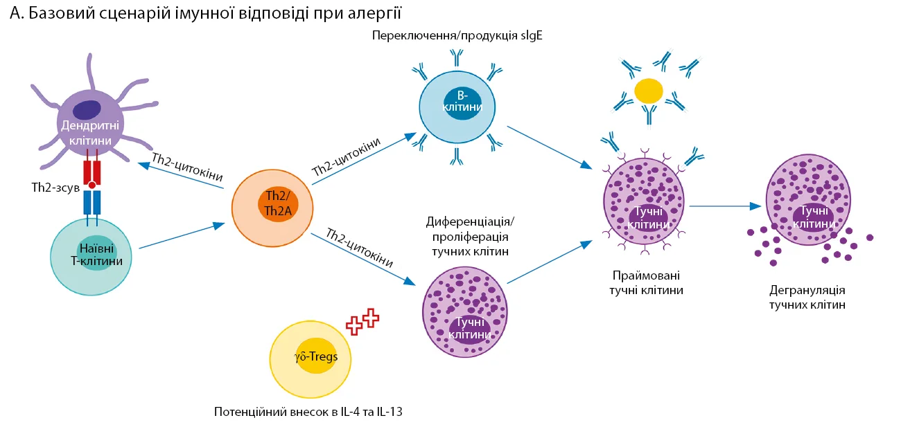А. Базовий сценарій імунної відповіді при алергії. Цитокіни Th2 сприяють стимуляції плазматичних клітин і виробленню IgE, а також подальшій диференціації в бік Th2. Вироблення IgE-антитіл, специфічних до алергену, та їх адсорбція на поверхні тучних клітин під час зв’язування з алергеном призводять до дегрануляції й алергічного запалення. Т-фолікулярні хелпери та γδ-регуляторні Т-клітини можуть сприяти зміщенню в бік Th2 і виробленню IL-13 та IL-4 (характерних цитокінів Th2).