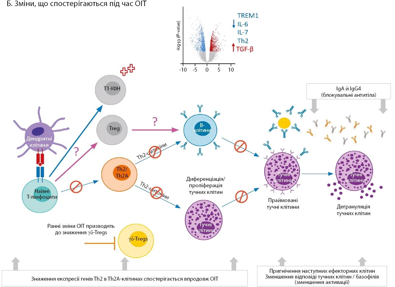 Б. Зміни, що спостерігаються під час ОІТ, включають клональну анергію Т-клітин з Th2-фенотипом, зниження експресії генів Th2 в людей з алергією на арахіс і зниження продукції антигеноспецифічних IgE-антитіл. Паралельно збільшується продукція sIgG4, який конкурує за зв’язування sIgE. Продемонстровано деметилювання локусу FOXP3 у Т-регуляторних клітинах, що корелює з результатами лікування. Зниження частоти γδ-Т-лімфоцитів спостерігається на ранніх стадіях ОІТ, що може сприяти втраті домінування Th2-лімфоцитів. Кілька досліджень CD4+ Т-клітин виявили нову підгрупу Т-хелперів, які експресують ІФН-стимульовані гени 1-го типу (T1-ІФН). Хоча функція цих клітин до кінця не з’ясована, T1-ІФН відіграють важливу роль у диференціюванні Т-клітин і регуляції Т-фолікулярних клітин-хелперів, а отже, можуть регулювати Th2 і вироблення антитіл.