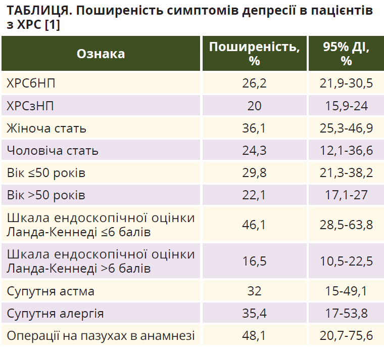 При проведенні метааналізу 32 досліджень із залученням 56 933 пацієнтів установлено, що поширеність симптомів депресії в пацієнтів з ХРС становить 24,7% (95% довірчий інтервал (ДІ) 21,3-28,1%), а поширеність симптомів тривоги при ХРС становить 29,7% (95% ДІ 19,3-40,2%). Аналіз підгруп представлено в таблиці [1].