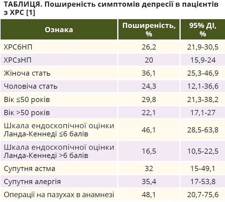При проведенні метааналізу 32 досліджень із залученням 56 933 пацієнтів установлено, що поширеність симптомів депресії в пацієнтів з ХРС становить 24,7% (95% довірчий інтервал (ДІ) 21,3-28,1%), а поширеність симптомів тривоги при ХРС становить 29,7% (95% ДІ 19,3-40,2%). Аналіз підгруп представлено в таблиці [1].