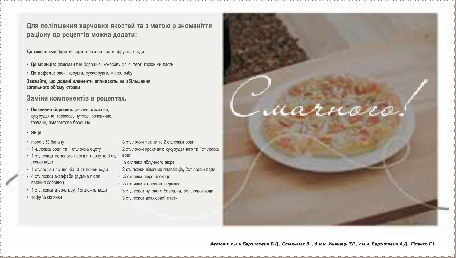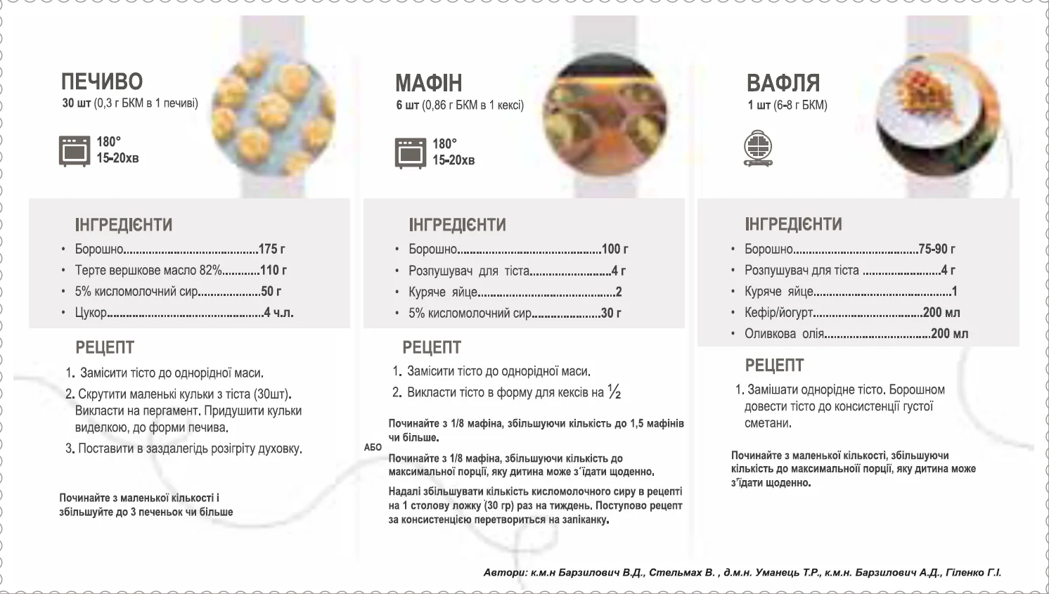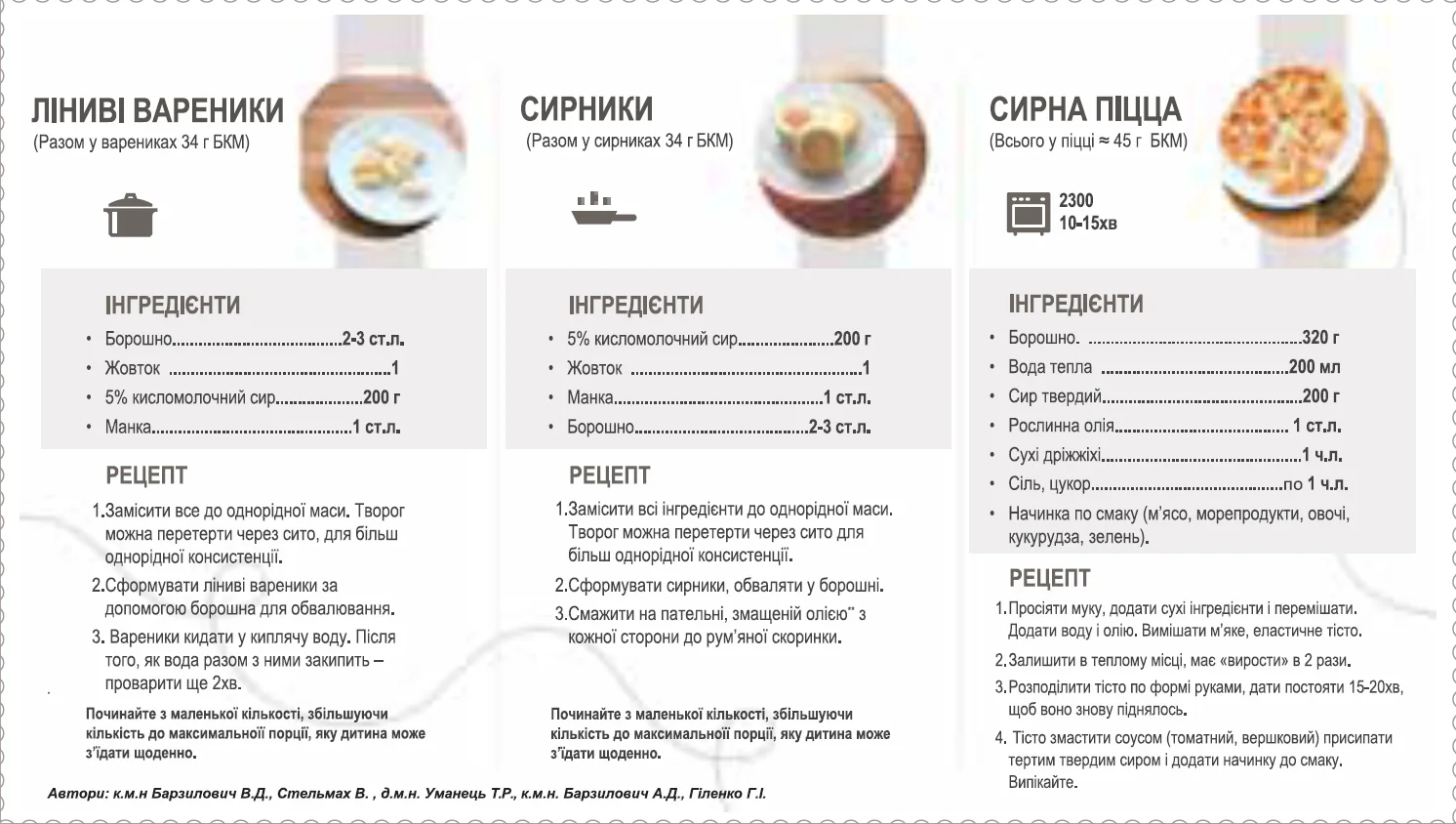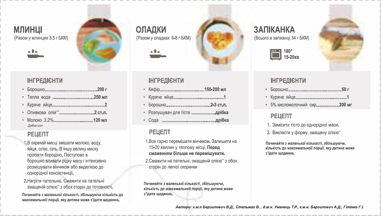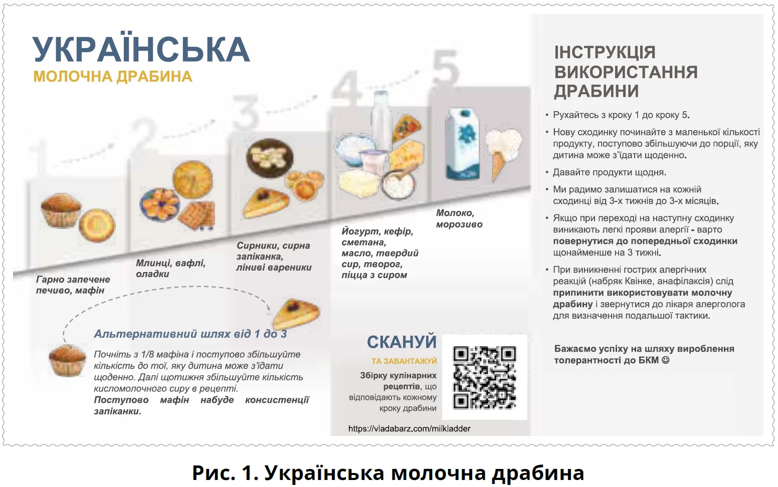 Українську молочну драбину доповнено збіркою кулінарних рецептів, які відповідають кожній її сходинці, враховуючи особливості української національної кухні та поширені рекомендації громадської охорони здоров’я щодо низького споживання вільного цукру дітьми та дорослими [9]. Крім того, було включено альтернативні варіанти заміни пшениці та яєць, а також істотних додаткових харчових алергенів.