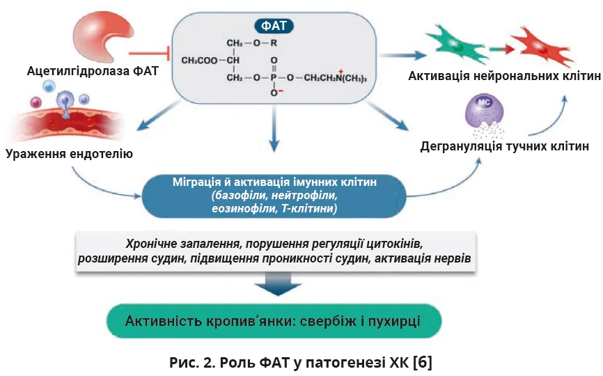 Крім цього, важливу роль у патогенезі відіграє фактор, що активує тромбоцити (ФАТ). Він індукує дегрануляцію тучних клітин, сприяє вивільненню гістаміну й інших прозапальних медіаторів, тобто посилює такі клінічні прояви ХК, як свербіж, набряк і висипання (рис. 2).