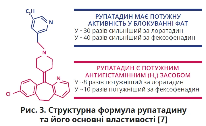 Одним з перспективних методів лікування ХК вважають застосування засобів, які здатні блокувати ФАТ. Цього ефекту можна досягти за допомогою рупатадину – сучасного неседативного АГП, який, окрім антагоністичної дії на H1-рецептори, здатний впливати на рецептори ФАТ [17, 24]. Дослідження Munoz-Cano та співавт. довело, що рупатадин інгібує ФАТ-індуковану дегрануляцію тучних клітин у концентраціях 1-10 μM; це підтверджує його прямий вплив на ФАТ-опосередковані процеси [17]. Така особливість робить рупатадин унікальним АГП, оскільки він впливає одночасно на два ключові механізми розвитку ХК: традиційну H1-залежну дегрануляцію тучних клітин і ФАТ-опосередковану активацію тромбоцитів та ендотелію. Вважають, що призначення рупатадину не лише зменшує дегрануляцію тучних клітин, інгібує вивільнення гістаміну, але й, імовірно, опосередковано сприяє зниженню рівня D-димеру та корекції ендотеліальної дисфункції [15, 17].