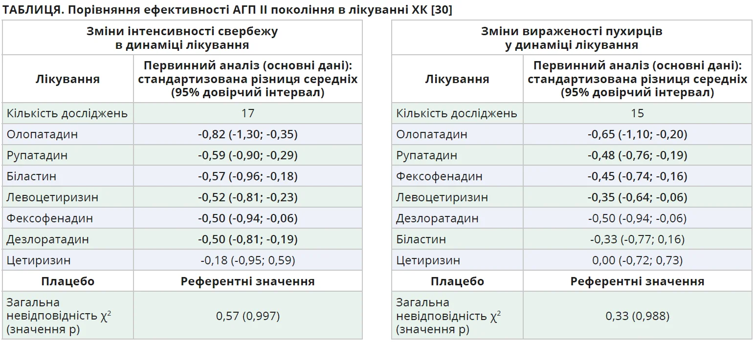 Клінічну значущість подвійного механізму дії рупатадину розкривають результати великого мережевого метааналізу, заснованого на даних 22 рандомізованих контрольованих досліджень, які проведені за участю 3943 хворих на ХСК [30]. У цьому метааналізі порівнювали ефективність ліцензованих доз різноманітних АГП II покоління для контролю двох основних симптомів ХК: свербежу та пухирців. Найвищу результативність продемонстрував олопатадин. Водночас його клінічне використання значно обмежене, адже цей препарат зареєстрований виключно в Японії та недоступний у країнах Європейського Союзу й Україні. Другу позицію в рейтингу впевнено посів рупатадин (табл.). Він довів свою здатність достовірно зменшувати свербіж (-0,59; 95% ДІ від -0,90 до -0,29) і кількість пухирців (-0,48; 95% ДІ від -0,76 до -0,19). Серед АГП II покоління, реально доступних на вітчизняному ринку, саме рупатадин визнано найпотужнішим засобом для купіювання провідних симптомів ХК. Автори метааналізу підкреслили клінічно значущі факти: ефективність цетиризину в зменшенні свербежу та кількості пухирців не відрізняється від такої плацебо, а здатність біластину нівелювати пухирці виявилася найнижчою серед усіх сучасних АГП II покоління [30].