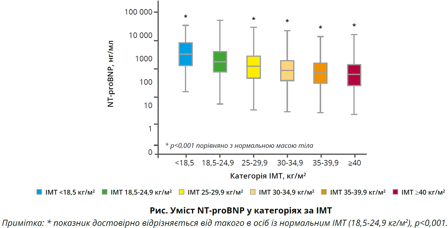 В осіб з ожирінням у ході діагностики СН покладатися виключно на НУП і NT-proBNP не можна, оскільки низькі рівні не дають можливості однозначно виключити СН зі збереженою фракцією викиду лівого шлуночка (Buckley L.F. et al., 2018). Натомість за недостатньої маси тіла вміст NT-proBNP є вищим порівняно з особами з нормальною вагою (рис.), що може призводити до діагностичних помилок (Vergaro G. et al., 2021). Зниження NT-proBNP в осіб з ожирінням і СН пояснюється порушенням нейрогормональної активації. Імовірно, в цієї субпопуляції пацієнтів доцільним буде раннє призначення сакубітрилу/валсартану (Gaborit F.S. et al., 2020).