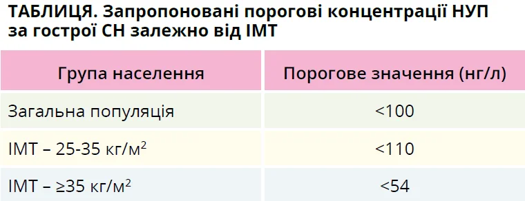 І навпаки, низька концентрація НУП здатна спричинити інсулінорезистентність, непереносимість глюкози, збільшення кількості жирової тканини, затримку рідини й підвищення ризику розвитку ЦД 2 типу, артеріальної гіпертензії та ССЗ (Bolivar Malachias M.V. et al., 2022; Beleigoli A.M. et al., 2009; Clerico A. et al., 2012; Santhekadur P.K. et al., 2017). Наявність низьких рівнів НУП на тлі ожиріння має велике значення в клінічній практиці, оскільки пацієнти з ожирінням часто мають задишку, водночас типові ознаки СН (підвищений тиск у яремних венах, третій тон серця, зміщення верхівкового поштовху та набряк гомілок) у них можуть не виявлятися. Паралельно на тлі ожиріння погіршується якість рентгенографічного й ехокардіографічного зображення серця, що зумовлює доцільність використання лабораторних біомаркерів СН. Для пацієнтів з ожирінням запропоновано застосовувати відмінні від загальної популяції порогові значення нормальних показників НУП (табл.), оскільки при застосуванні класичних порогових значень можна отримати хибнонегативний результат у 20% пацієнтів із гострою СН (Reinmann M., Meyer P., 2020).