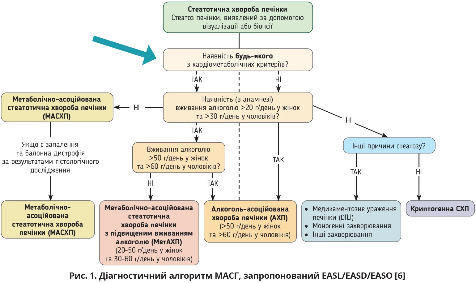 Відкрила семінар Олена Бака, яка навела сучасні дефініції стеатотичної хвороби печінки (СХП) та метаболічно-асоційованого стеатогепатиту (МАСГ) згідно з практичною настановою, підготовленою Європейською асоціацією з вивчення печінки (EASL), Європейською асоціацією з вивчення діабету (EASD) та Європейською асоціацією з вивчення ожиріння (EASO) [6]. Пильна увага до СХП пов’язана зі здатністю цієї патології прогресувати, починаючи від стеатозу до МАСГ, фіброзу та цирозу печінки (ЦП) та навіть МАСГ-асоційованої гепатоцелюлярної карциноми (ГЦК) [6]. Відповідно до положень спеціалізованої практичної настанови EASL/EASD/EASO з діагностики та лікування МАСГ одним з основних кроків на шляху діагностики цієї патології є виявлення будь-якого кардіометаболічного фактора ризику (рис. 1).