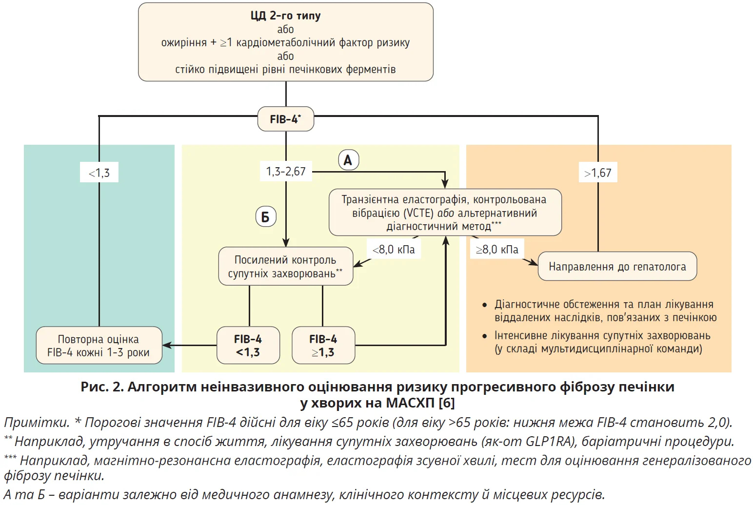 Окрім визначення факторів ризику, настанова EASL/EASD/EASO пропонує алгоритм неінвазивного оцінювання ризику прогресивного фіброзу печінки в пацієнтів з метаболічними факторами ризику або ознаками СХП (рис. 2), який заснований на розрахунку індексу фіброзу (FIB-4). Ризик розвитку ЦП вважають малоймовірним, якщо значення FIB-4 нижче 1,45; цей ризик стає високоймовірним за умови перевищення значення 3,25. У проміжних випадках, коли показники FIB-4 коливаються в межах 1,45-3,25, ризик наявності ЦП вважають сумнівним.