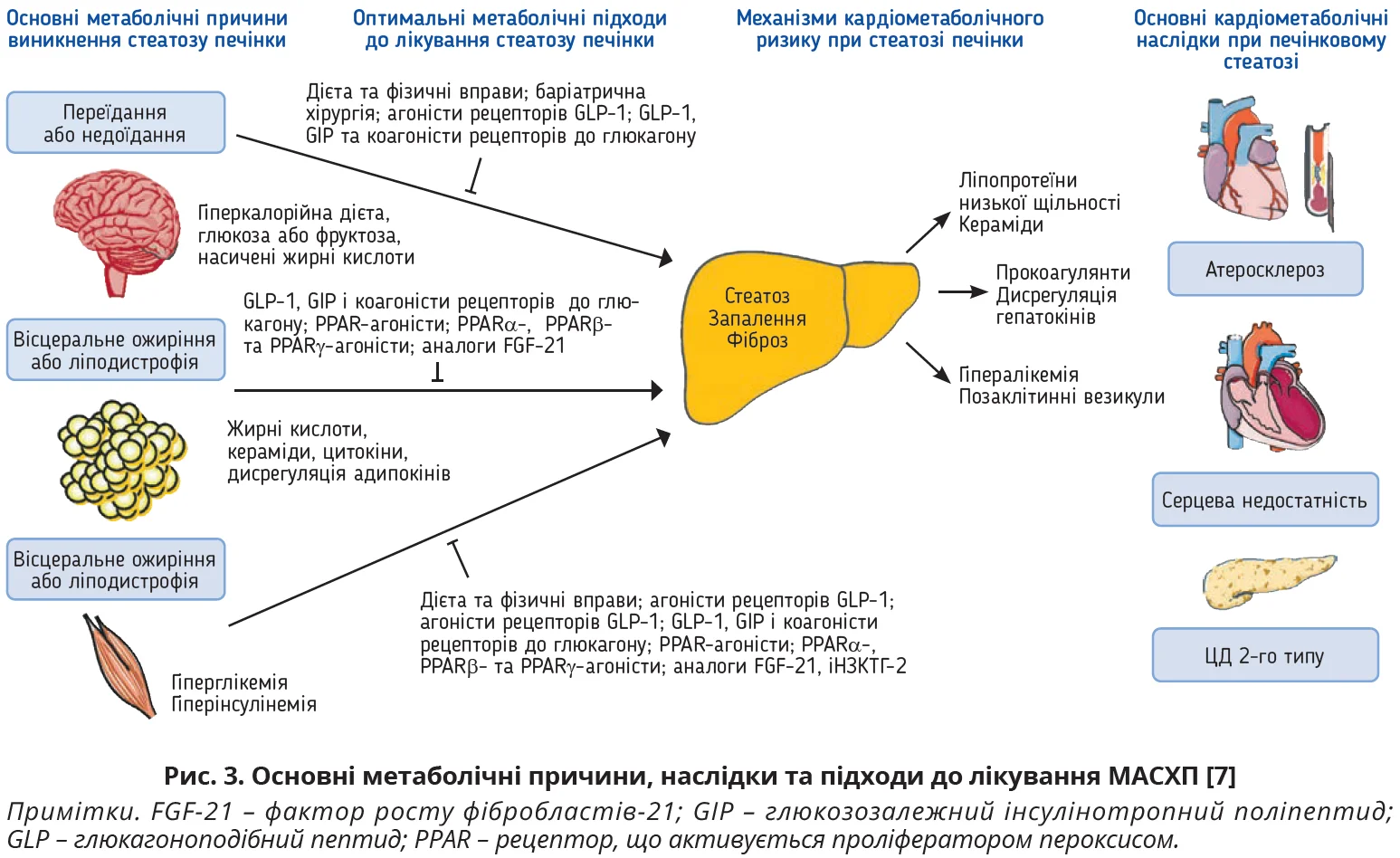 Відповідно до сучасних поглядів на патофізіологічні механізми розвитку МАСГ підходи до корекції цієї патології передбачають не тільки корекцію стеатозу печінки, але й захист серцево-судинної системи (рис. 3).