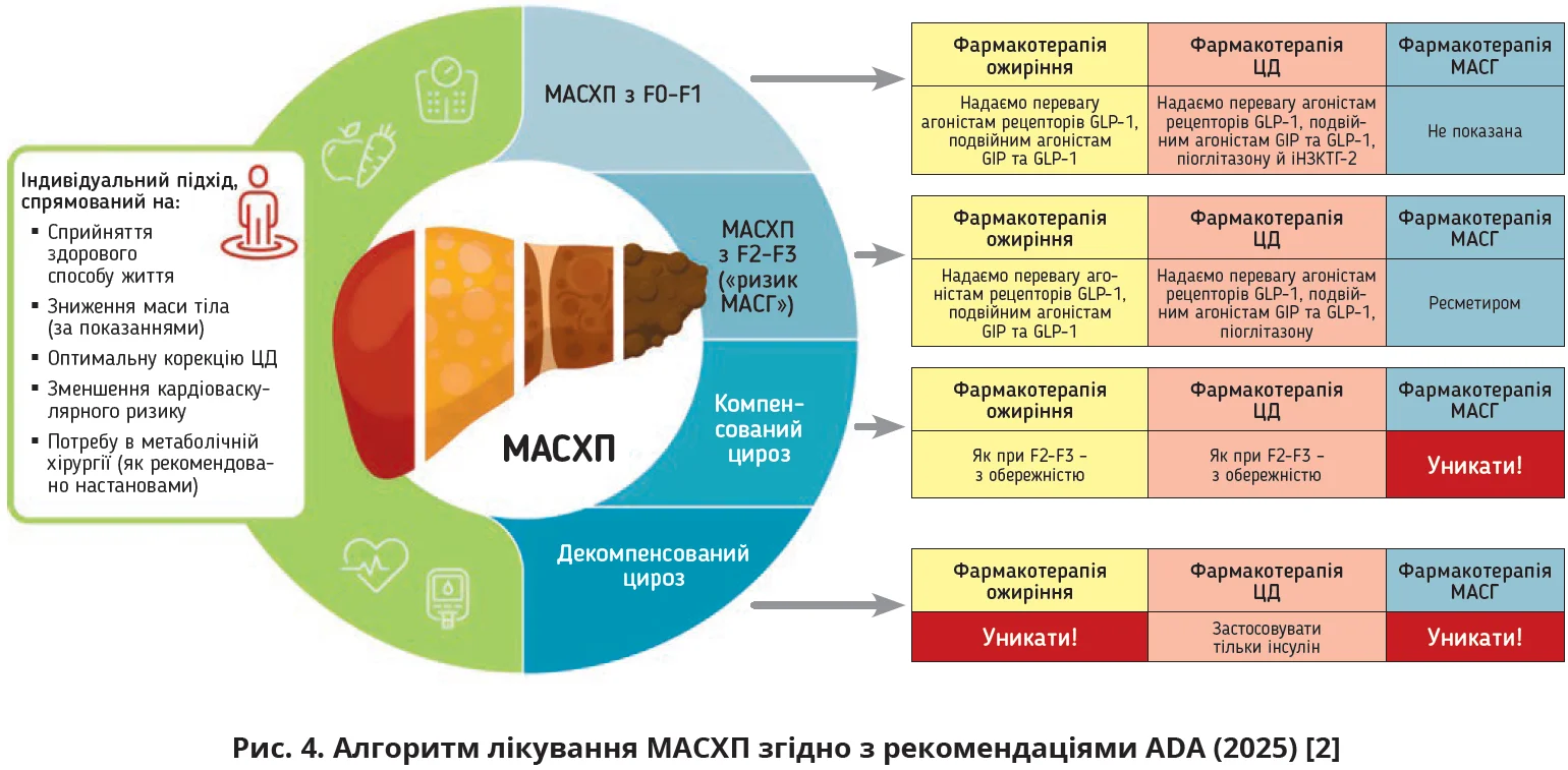 В оновлених рекомендаціях ADA з лікування ЦД у хворих на МАСХП (2025) з’явилося нове положення: «Якщо потрібне додаткове зниження серцево-судинного та ниркового ризиків, лікування інших метаболічно-асоційованих супутніх захворювань та/або зниження глікемії, слід додати препарати з потенційними перевагами щодо зниження ризику МАСХП або МАСГ» [2]. До таких препаратів експерти ADA відносять агоністи рецепторів GLP-1, подвійні агоністи GIP і GLP-1, піоглітазон, комбінацію агоніста рецепторів GLP-1 з піоглітазоном [2]. Зазначена рекомендація була зроблена з огляду на сприятливий метаболічний вплив перелічених ліків на стан печінки у хворих на МАСХП/МАСГ. Представники ADA підкреслюють, що лікування треба проводити з урахуванням маси тіла пацієнта: за потреби зниження маси тіла призначати ліраглутид і семаглутид, за потреби збільшення ІМТ рекомендувати піоглітазон і ланіфібранор, у пацієнтів зі збереженою вагою застосовувати ресметиром [2].
