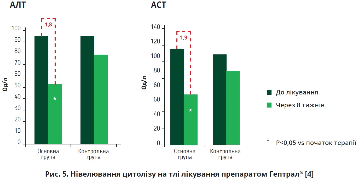 Клінічна ефективність препарату Гептрал® оцінювалася в різноманітних дослідженнях. В одному з них хворих на МАСХП (n=62) рандомізували для 8-тижневого перорального прийому Гептрал® (адеметіонін; n=31) або вітаміну Е (n=31) [4] (в оригінальному тексті згаданого дослідження використовується термін «неалкогольна жирова хвороба печінки» (НАЖХП). – Прим. ред.). Пацієнтам основної групи призначали адеметіонін у дозі 500 мг 2 рази на добу, хворі контрольної групи отримували вітамін Е 200 мг 3 рази на добу. Терапія препаратом Гептрал® (SAMe) сприяла вірогідному зниженню трансаміназ (рис. 5), нормалізації ліпідного профілю порівняно з групою контролю.