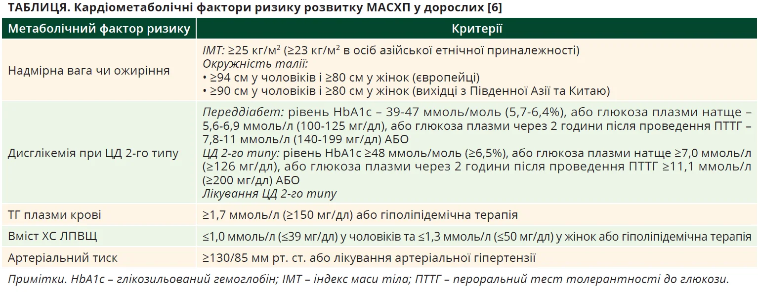 Перелік кардіометаболічних змін, які спричиняють розвиток МАСХП і МАСГ, залишився майже незмінним: надмірна вага чи ожиріння, явища дисглікемії на тлі цукрового діабету (ЦД), зростання рівня тригліцеридів (ТГ), зниження вмісту холестерину (ХС) ліпопротеїнів високої щільності (ЛПВЩ), підвищення артеріального тиску (табл.).