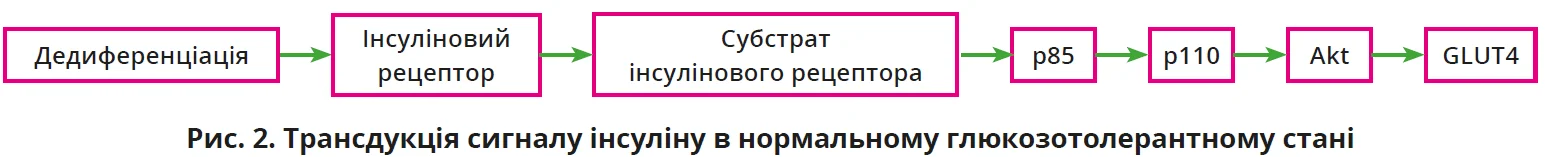 Одним з найважливіших позапанкреатичних факторів виникнення Д2Т вважається ІР скелетних м’язів. У фізіологічному стані інсулін сприяє виробленню глікогену в скелетних м’язах шляхом поглинання глюкози з плазми крові. Важливих фактором у цьому процесі є транспортер глюкози 4-го типу (GLUT4), який переміщується з внутрішньоклітинних компартментів після зв’язування інсуліну з інсуліновим рецептором у клітинах м’язів, що дає змогу поглинати глюкозу (рис. 2).