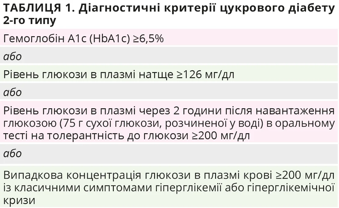 За визначенням, Д2Т – це складна багатосистемна метаболічна хвороба, що характеризується високим рівнем глюкози в крові внаслідок прогресивного дефекту секреції інсуліну з різним ступенем дисфункції β-клітин та/або тканинної резистентності до інсуліну. Існує сильний зв’язок між ожирінням і Д2Т, що охоплює шляхи контролю споживання їжі та витрат енергії, які регулюються центральною нервовою системою. Слід зазначити, що Д2Т не є винятково хворобою людей старших вікових груп; останнім часом захворюваність серед осіб віком до 40 років зросла у 2-3 рази. Щоби правильно діагностувати й розпізнати Д2Т у молодих людей, потрібно виключити інші типи діабету: цукровий діабет 1-го типу (Д1Т), латентний автоімунний діабет дорослих (LADA) та діабет зрілого віку молодих людей (MODY). Правильна діагностика важлива з огляду на прогноз, можливі ускладнення та вибір терапії. Критерії діагнозу Д2Т у невагітних дорослих за настановами Американської діабетичної асоціації підсумовує таблиця 1.