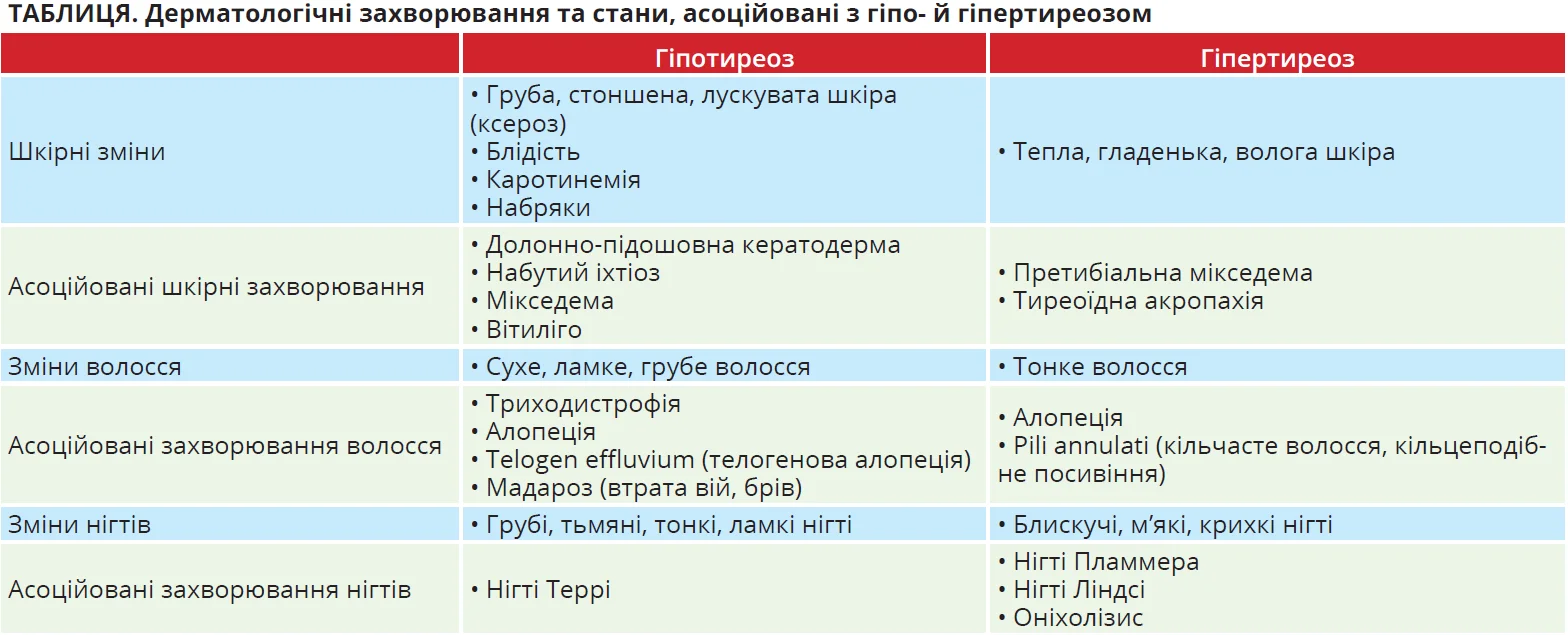 Шкірні прояви зазвичай є першими видимими ознаками дисфункції ЩЗ і можуть слугувати причиною звернення пацієнта до лікаря задовго до розвитку загрозливих ускладнень із боку інших органів і систем. Тому розпізнавання та правильне трактування змін із боку шкіри, волосся й нігтів, характерних для певних захворювань ЩЗ, є вкрай важливими для своєчасної діагностики та терапії цих захворювань. У цьому матеріалі поданий огляд основних дерматологічних станів, асоційованих із гіпер- і гіпофункцією гормонів ЩЗ. Перелік цих захворювань представлено в таблиці.
