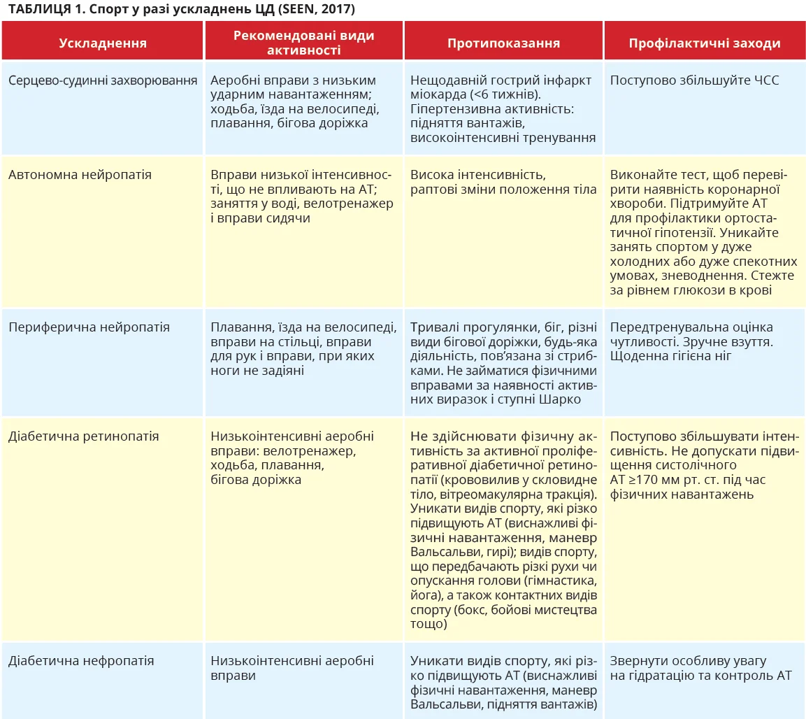 Досить складне й делікатне питання: шкодить чи допомагає фізична активність пацієнтам, які вже мають ускладнення ЦД? Деталізовані рекомендації та пояснення щодо цього містять настанови RECORD Іспанського товариства ендокринології та харчування (SEEN), датовані 2017 роком (табл. 1).
