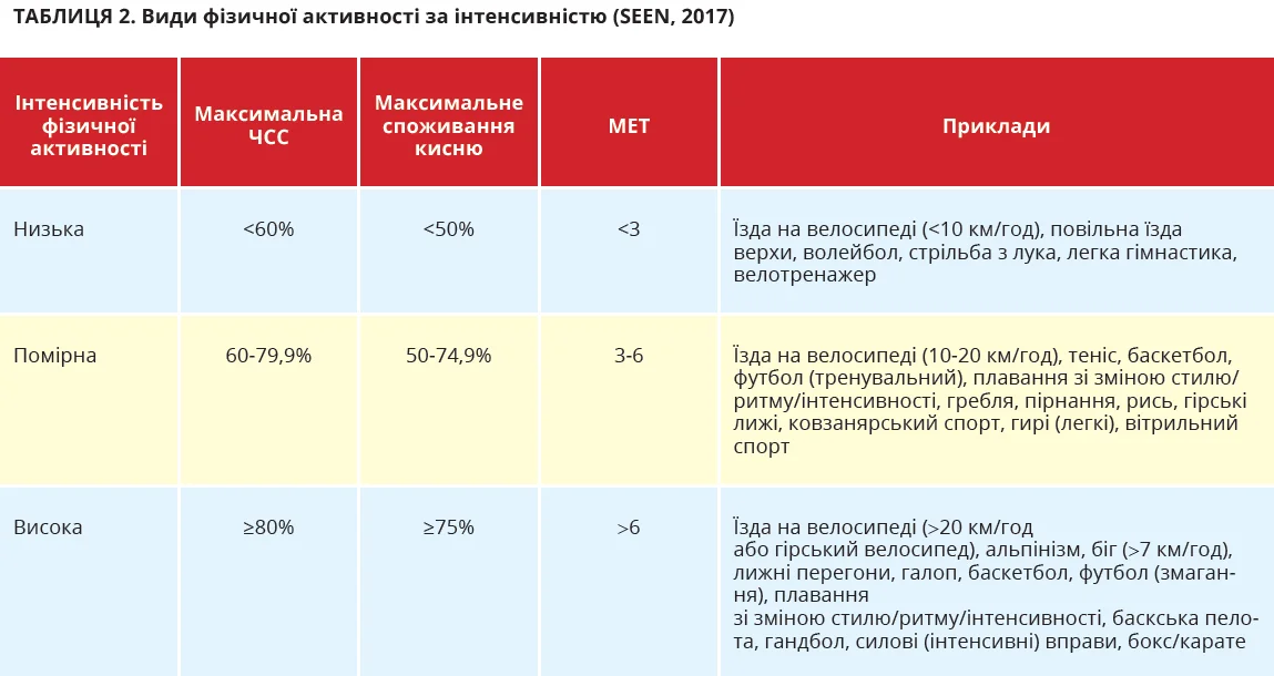 Види фізичної активності поділяються на низько-, помірно- й високоінтенсивні (табл. 2).
