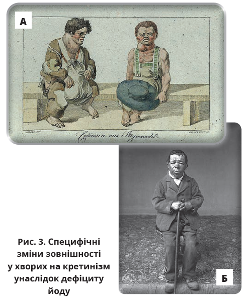 Невипадково французьке слово chretien (кретин) походить від латинського christianus (християнин); його в середні віки монахи застосовували стосовно хворих на психічні розлади (синоніми: божа людина, юродивий і т. ін.). Також вони помітили нерівномірну поширеність кретинізму й закономірність, що частота хвороби серед населення підвищується прямо пропорційно висоті проживання над рівнем моря. Із цим показником корелювала й поширеність аномалій, характерних для хворих на кретинізм: товста шия (ендемічний зоб), карликовість, збільшення язика (рис. 3А, 3Б).