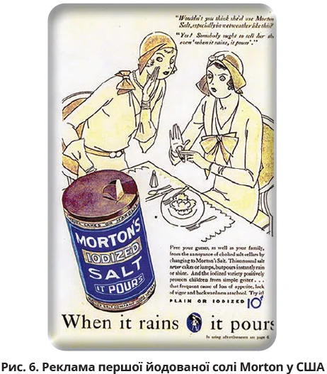 Чотири роки потому, в 1921 році, на авторитетному медичному симпозіумі вперше прозвучала пропозиція запровадити йодування солі для запобігання виникненню простого зоба. 1 травня 1924 року йодована сіль з’явилася на полицях магазинів у Мічигані (рис. 6). Рівень спротиву до її використання був настільки сильним, що початково пропонували маркувати нову сіль значком черепа та схрещених кісток, який застосовувався для ідентифікації отрут. Однак здоровий глузд і наукові аргументи все ж перемогли.