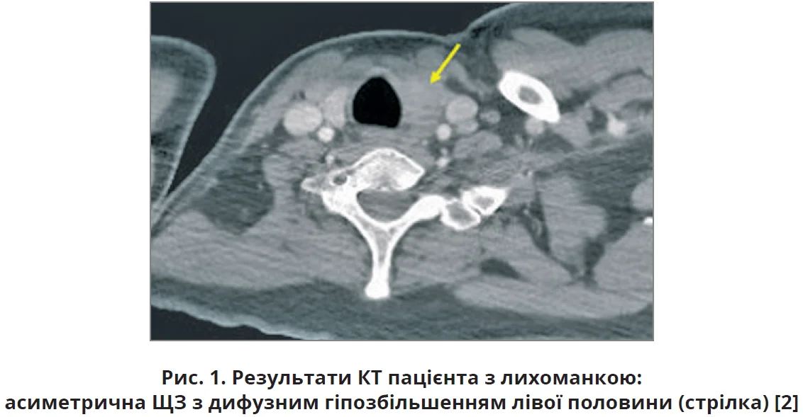 Виявлено асиметричну ЩЗ з дифузним гіпозбільшенням лівої половини з помутнінням навколо (рис. 1). Сонографія виявила асиметричний зоб із частковою гіпоехогенністю з нерівними краями в нижніх частинах обох часток; сигнал кольорового потоку Допплера був низьким.