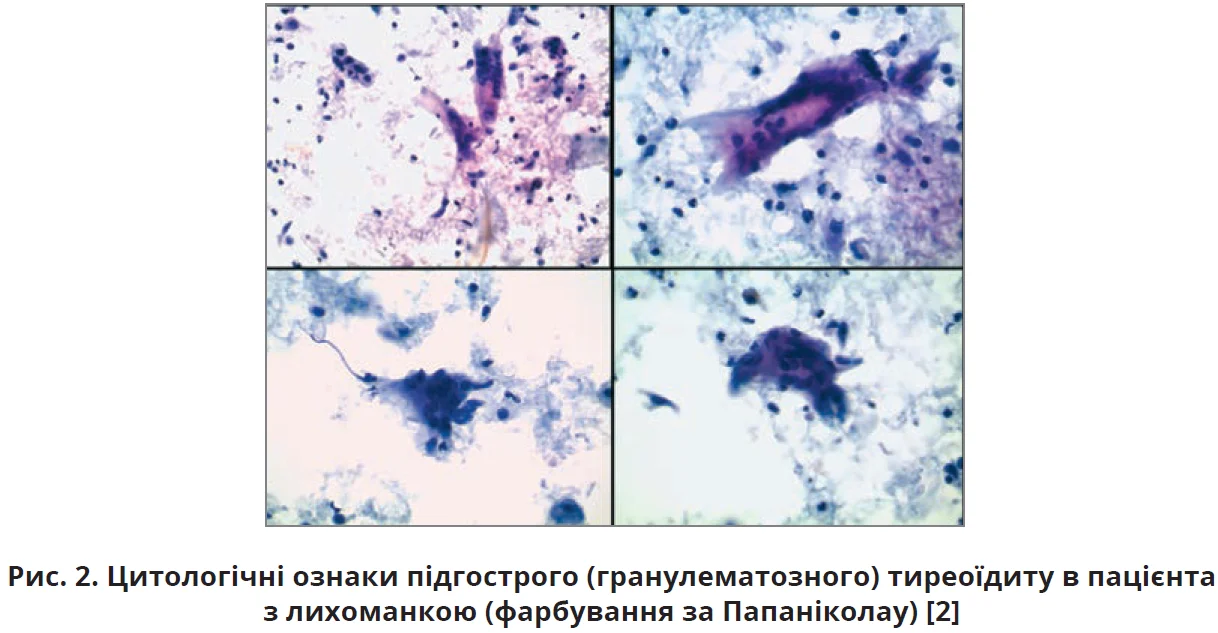 Сироватковий тиреотропний гормон (ТТГ) під час первинного обстеження був у межах норми (0,41 мОд/л). Рівень тиреоглобуліну в сироватці крові через 2 тижні після першого звернення становив 58,4 мкг/л і знизився до 18,7 мкг/л через 3 тижні. Прицільна тонкоголкова аспіраційна біопсія (FNAB) аберації ЩЗ показала суміш доброякісних на вигляд фолікулярних клітин і змішаних запальних клітин, включаючи значну кількість багатоядерних гігантських клітин, гістіоцитів та епітеліоїдних клітин, лімфоцитів і нейтрофілів. Цитологічні ознаки відповідали гранулематозному (підгострому) тиреоїдиту (рис. 2).
