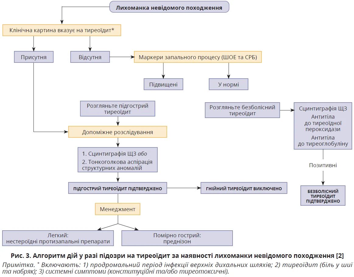 Отже, ця незвичайна презентація поширеної медичної проблеми підкреслює важливість розгляду підгострого тиреоїдиту в диференційній діагностиці лихоманки невідомого походження. Запропонований підхід до тиреоїдиту як можливої причини лихоманки невідомого походження представлено на рисунку 3.