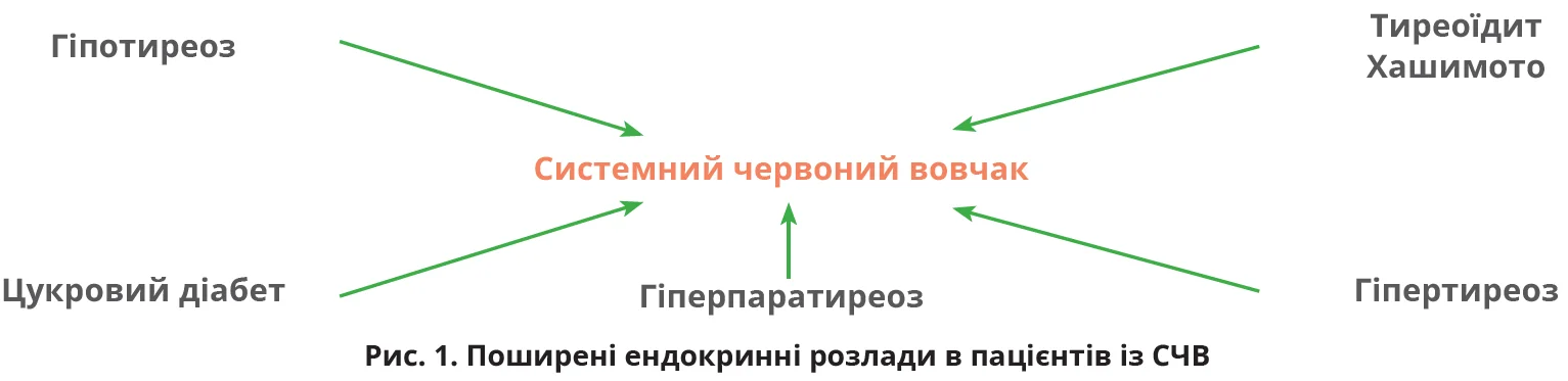 Розпізнавання ендокринної патології в пацієнтів із СЧВ є вкрай важливим через схожість на симптоми вовчака; проте лікування цих станів різне. Діагностика та лікування ендокринних проб­лем у разі СЧВ сприяють полегшенню симптомів і можуть мати значення у виборі тактики лікування, що забезпечує покращення менеджменту пацієнтів.