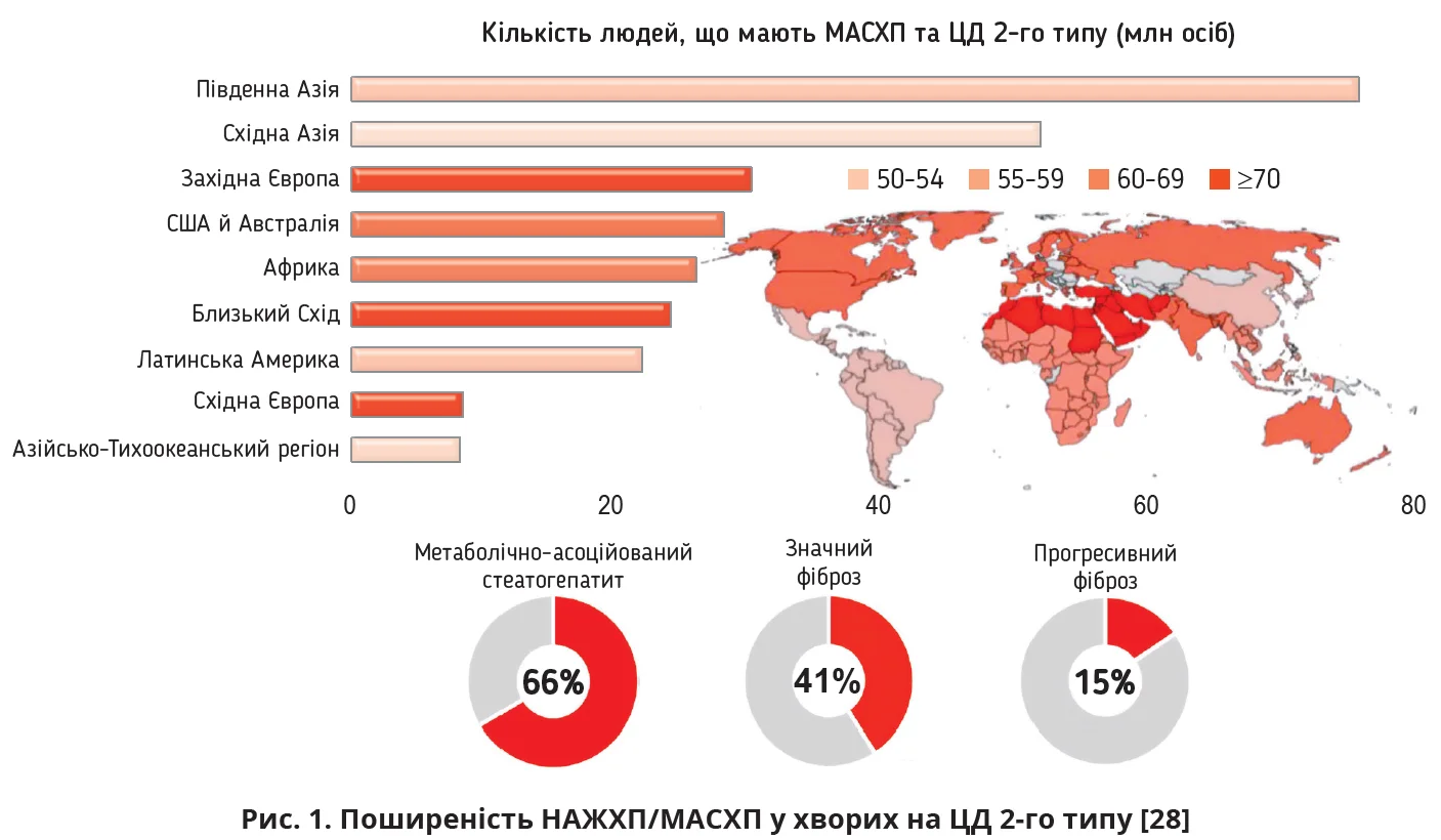 Останні цифри, наведені в масштабному метааналізі 123 досліджень (у яких значну кількість хворих становили пацієнти з ЦД 2-го типу, n=2 224 144), яскраво підкреслюють актуальність цієї проблеми. Нині глобальна об’єднана поширеність НАЖХП/МАСХП серед хворих на ЦД 2-го типу оцінюється в 65,33% (95% довірчий інтервал (ДІ) 62,35-68,18%) [28]. Науковці не тільки відзначили тенденцію (р=0,07) до значущого зростання цього показника з 55,86% (95% ДІ 42,38-68,53%) у 1990-2004 рр. до 68,81% (95% ДІ 63,41-73,74%) у 2016-2021 рр., а й визначили регіони з найбільшою поширеністю цієї патології (рис. 1).