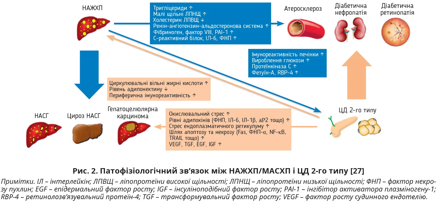 Своєю чергою, внутрішньопечінкове накопичення жиру активує запалення печінки, яке створює умови для розвитку атерогенної дисліпідемії (збільшення вмісту холестерину ліпопротеїнів низької щільності, тригліцеридів і зниження холестерину ліпопротеїнів високої щільності) й артеріальної гіпертензії через активацію ренін-ангіотензин-альдостеронової системи. Одночасно відбувається активація системного запального стану (підвищення рівня С-реактивного білка, прозапальних цитокінів) і процесів коагуляції [22, 27]. Усе це створює умови для розвитку діабетичних макро- та мікросудинних ускладнень. З іншого боку, ЦД 2-го типу й системна інсулінорезистентність спричиняють збільшення потоку вільних жирних кислот з периферичних тканин до печінки, що знову призводить до збільшення внутрішньопечінкового вмісту жиру та, відповідно, прогресування НАЖХП/МАСХП до НАСГ, цирозу й гепатоцелюлярної карциноми (ГЦК) [10, 27].