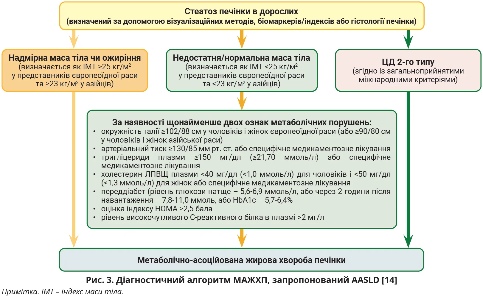 Факти. Такі провідні міжнародні організації, як Європейська асоціація з вивчення печінки (EASL) [8, 13] і Американська асоціація з вивчення хвороб печінки (AASLD) [14], не тільки пропонують використовувати нові терміни, а й рекомендують здійснювати діагностику СХП/МАСХП на підставі нових діагностичних критеріїв. Класифікацію НАЖХП було змінено у зв’язку з новими даними щодо виникнення та прогресування хвороби, через це модифікації зазнала не лише назва, але й підходи до діагностики та лікування. Згідно з визначенням метаболічно-асоційованої жирової хвороби печінки (МАЖХП), запропонованим експертами AASLD, виявлення лабораторно-інструментальних ознак стеатозу печінки у хворих на ЦД 2-го типу є достатнім підґрунтям для безпосереднього діагностування МАЖХП (рис. 3).
