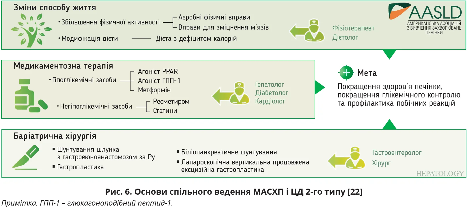Факти. Сучасні погляди на ведення хворих з такою комбінованою патологією спочатку можуть здатися дуже подібними до звичайних стандартів ведення пацієнтів окремо з МАСХП і ЦД, але є деякі особливості. Спільне ведення МАСХП і ЦД ґрунтується на трьох китах: модифікації способу життя, призначенні медикаментозної терапії, виконанні хірургічних втручань (рис. 6).