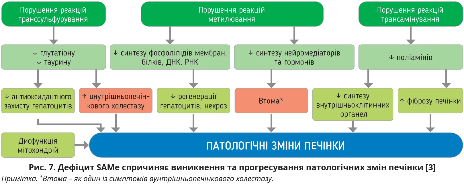 Гепатопротекторну активність SAMe при МАСХП із внутрішньопечінковим холестазом пояснюють підвищенням рівня глутатіону, посиленням активності біохімічних реакцій, які сприяють утворенню ліпопротеїнів дуже низької щільності та виведенню тригліцеридів, а також інгібуванням прозапальних цитокінів і апоптозу, опосередкованим підвищенням експресії фарнезоїдних Х-рецепторів (FRX) [20]. Отримані дані дають дослідникам змогу стверджувати, що SAMe значно зменшує накопичення ліпідів та окислювальний стрес у печінці головним чином завдяки покращенню β-окиснення в мітохондріях, видалення тригліцеридів з гепатоцитів. SAMe створює умови для нівелювання ендотеліальної дисфункції, сприяючи зменшенню накопичення ліпідів та інгібуючи синтез прооксидантів в ендотеліальних клітинах [26].