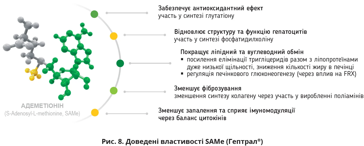 Факти. Встановлено, що SAMe (Гептрал®) відновлює функціональну здатність гепатоцитів завдяки антиоксидантному ефекту, відновленню структури та функції гепатоцитів, зменшенню активності запального процесу й фіброгенезу, сприятливому імуномодулювальному впливу [1, 6, 9, 20, 21]. У низці робіт яскраво продемонстровано здатність SAMe (Гептрал®) покращувати ліпідний і вуглеводний обмін завдяки елімінації тригліцеридів разом з ліпопротеїнами дуже низької щільності та зменшенню кількості жиру в печінці внаслідок впливу на FRX і регуляції активності печінкового глюконеогенезу [1, 6, 9, 20, 21].