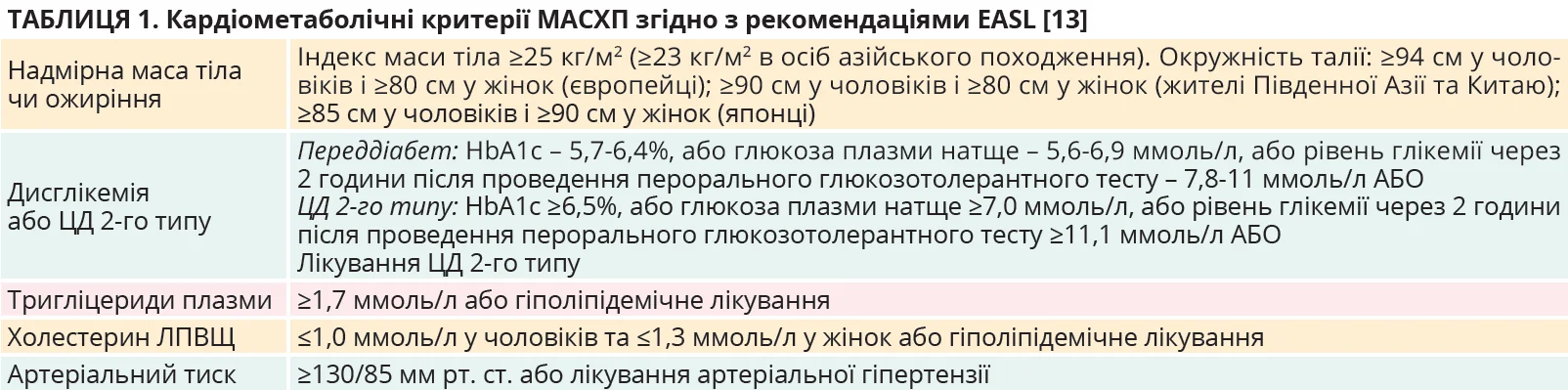 Експерти EASL, хоча наводять дещо інший перелік кардіометаболічних факторів, які потрібно використовувати при діагностиці МАСХП (табл. 1), також підкреслюють, що «ЦД 2-го типу й ожиріння (особливо абдомінальне) є метаболічними захворюваннями, які мають найбільший вплив на природний перебіг МАСХП, включно з прогресуванням МАСХП/МАСГ-пов’язаного фіброзу, цирозу печінки та ГЦК (рівень доказовості 2, сильний консенсус)» [13].
