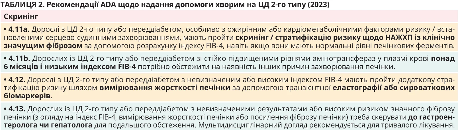 Факти. Положення відомої міжнародної настанови щодо надання допомоги хворим на ЦД 2-го типу, яку щорічно оновлюють експерти ADA [11], вже протягом декількох років підкреслюють доцільність скринінгу МАСХП у хворих на ЦД (табл. 2).