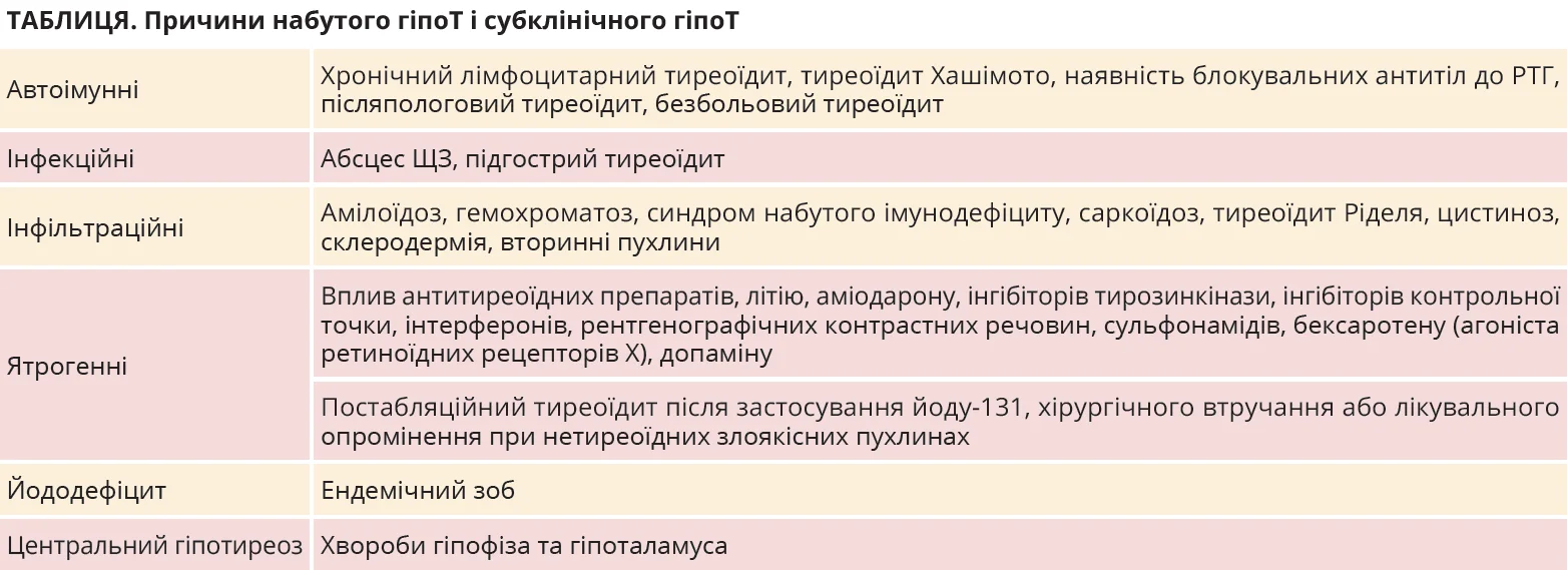 Клінічно явний гіпоТ визначають як поєднання підвищеного сироваткового рівня тиреотропного гормону (ТТГ) з низьким умістом циркулювальних гормонів ЩЗ. Цей розлад трапляється в 0,2-2% невагітних дорослих осіб. Своєю чергою, субклінічний гіпоТ діагностують тоді, коли вміст вільного T4 перебуває в межах норми, а рівень ТТГ перевищує верхню межу діапазону нормальних значень (4,0 мМО/л). Основні причини клінічно явного та субклінічного гіпоТ узагальнено в таблиці; найпоширенішою причиною є тиреоїдит Хашімото.
