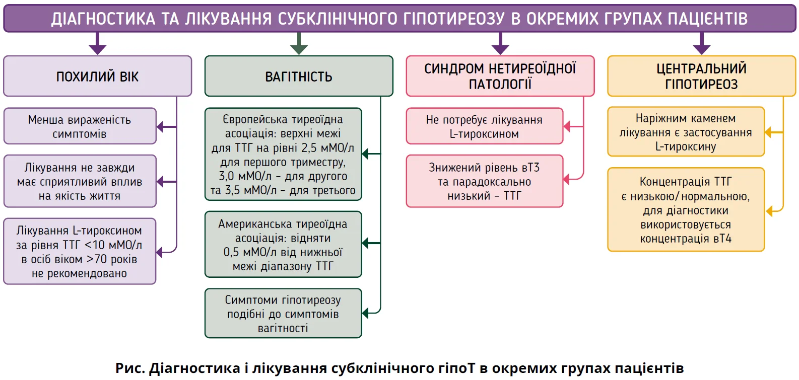 Поточні рекомендації щодо субклінічного гіпоТ враховують вік. Наприклад, лікування L-тироксином у разі концентрації ТТГ до 10 мМО/л у осіб віком >70 років не рекомендовано.
