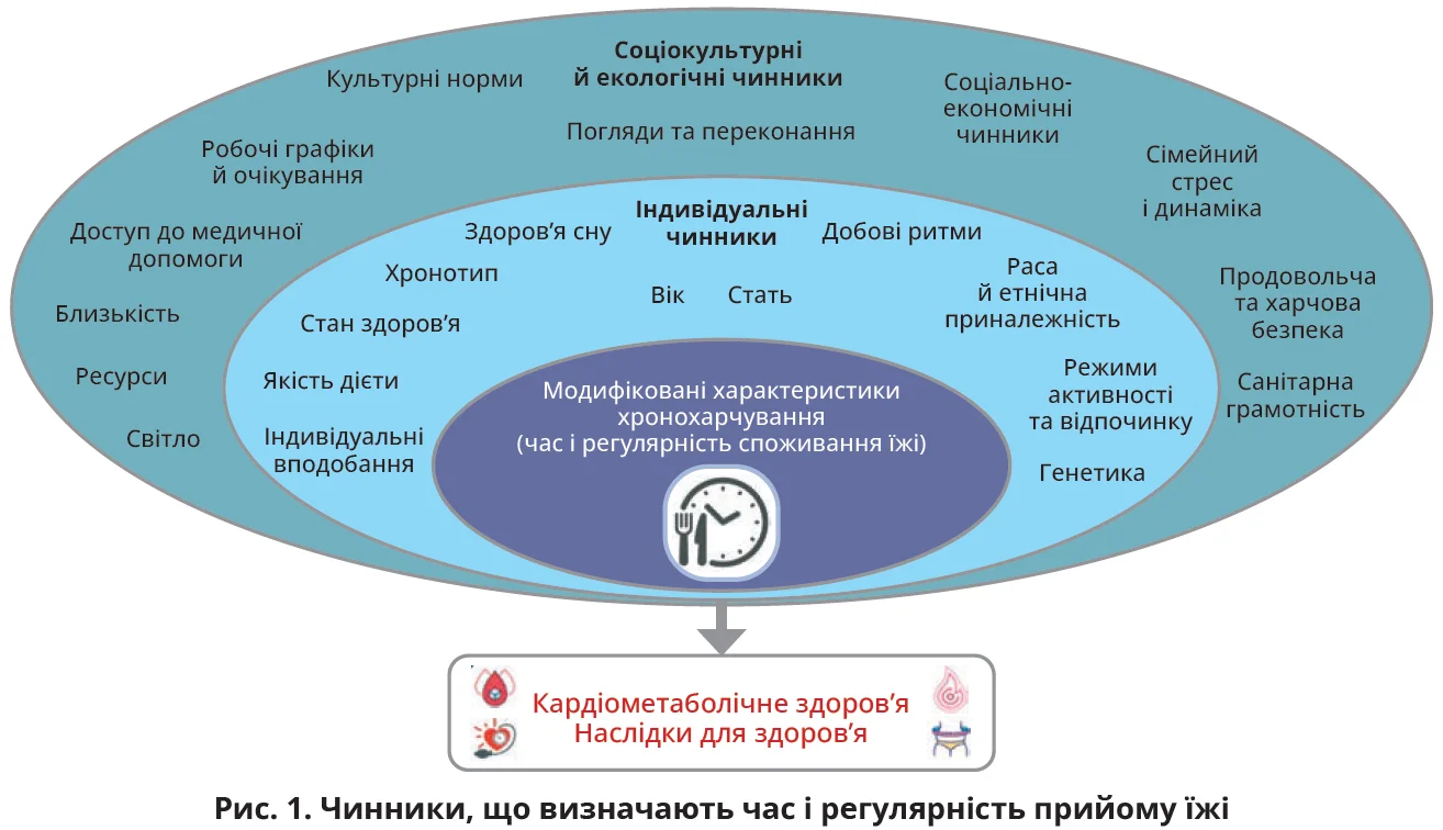 Хронохарчування – галузь епідеміології харчування, що розглядає складні зв’язки між часовими моделями харчування, циркадними ритмами й метаболічним здоров’ям, тобто вивчає вплив часу прийому їжі на збереження здоров’я та ризик розвитку хронічних захворювань. Час споживання їжі відносно циркадних добових ритмів особливо важливий для збереження кардіометаболічного здоров’я (КМЗ). За даними досліджень, на здоров’я метаболізму впливають не лише кількість та якість харчового раціону, а й час, регулярність і розподіл енергії між прийомами їжі впродовж доби та з дня на день. Особливості хронохарчування визначаються екологічними, культурними й фізіологічними чинниками, особистими вподобаннями та способом життя, котрі не тільки змінюють харчову поведінку, а й асоціюються з ожирінням, цукровим діабетом (ЦД) 2-го типу, метаболічним синдромом і серцево-судинними захворюваннями (ССЗ).