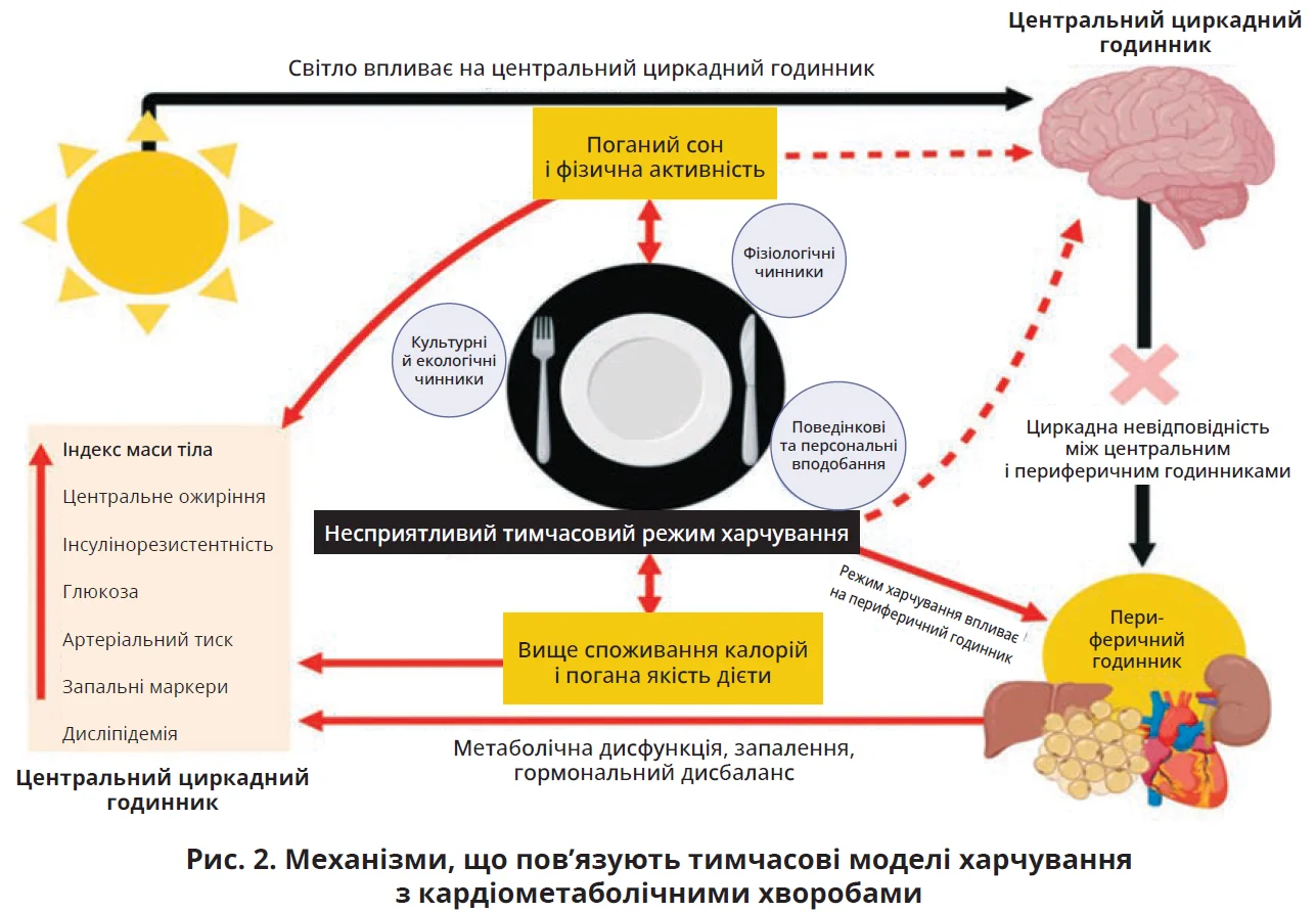 Вплив часу прийому їжі на КМЗ реалізується через різні механізми, пов’язані з порушенням циркадних ритмів, метаболічними й запальними процесами, гормональним дисбалансом та іншими поведінковими чинниками (рис. 2). Ритм центрального циркадного годинника, розташованого в супрахіазматичному ядрі гіпоталамуса, переважно визначається світловими сигналами. Ритми периферичних тканин насамперед регулюються зовнішніми сигналами, зокрема прийомом їжі. Несприятливі тимчасові схеми харчування (затримка та нерегулярність прийому їжі) здатні порушити синхронність периферичних і центральних годинників, що призводить до циркадного зміщення. Циркадіанний збій розладнує метаболічну регуляцію, спричиняючи порушення контролю глюкози, гіперінсулінемію, інсулінорезистентність, порушення відповіді інсуліну на глюкозу, що імітує переддіабетичний стан. Установлено, що пізній прийом їжі знижує толерантність до глюкози та порушує функцію β-клітин підшлункової залози в осіб з варіантом ризику ЦД 2-го типу MTNR1B. Час прийому їжі також впливає на рівні та добові моделі артеріального тиску (АТ). Короткочасний циркадний дисбаланс впливає на АТ шляхом модуляції вегетативної нервової системи: зниження симпатичної активності та посилення парасимпатичної активності. Крім того, зміщення циркадних ритмів зменшує секрецію мелатоніну, який знижує АТ. Зрештою, пізні та нерегулярні схеми харчування пов’язані з підвищенням С-реактивного білка (СРБ) – маркера системного запалення, пов’язаного з гіпертензією та серцево-судинними ускладненнями.