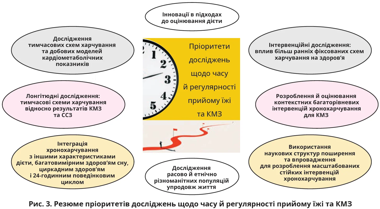Поведінкові й ендогенні циркадні ритми змінюються на різних етапах життя, з віком стабільність циркадних ритмів слабшає. Майбутні дослідження мають тривати впродовж життя, щоб з’ясувати впливи часу й регулярності прийому їжі на збереження КМЗ, стійкість серцево-судинної системи та здорове довголіття. Мало відомо про зв’язки соціальних детермінант здоров’я з показниками хронохарчування, котрі тісно переплітаються зі сном і циркадним здоров’ям. Пріоритети досліджень для розвитку хронохарчування, що сприятимуть перенесенню результатів у клінічну практику та створенню рекомендацій для охорони здоров’я, узагальнено на рисунку 3.