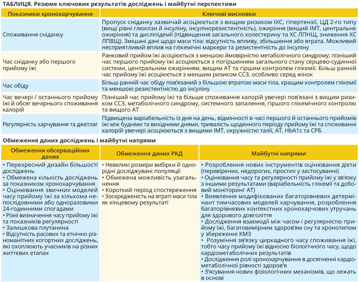 Результати спостережних та інтервенційних досліджень свідчать, що більш ранні й регулярні схеми харчування можуть сприяти КМЗ, але для інтеграції аспектів хронохарчування в практичні рекомендації та профілактичні підходи потрібно усунути багато прогалин у знаннях (табл.). На сьогодні нездорове харчування є основною причиною смерті в США, особливо від серцево-судинних і кардіометаболічних захворювань. Однак оцінка базується виключно на тому що, а не коли люди їдять. З’ясування впливу аспектів хронохарчування на здоров’я дасть змогу оцінити справжній вплив дієти на хронічні хвороби, розкриваючи нові можливості для розроблення та впровадження гнучких здійсненних утручань у реальних умовах.