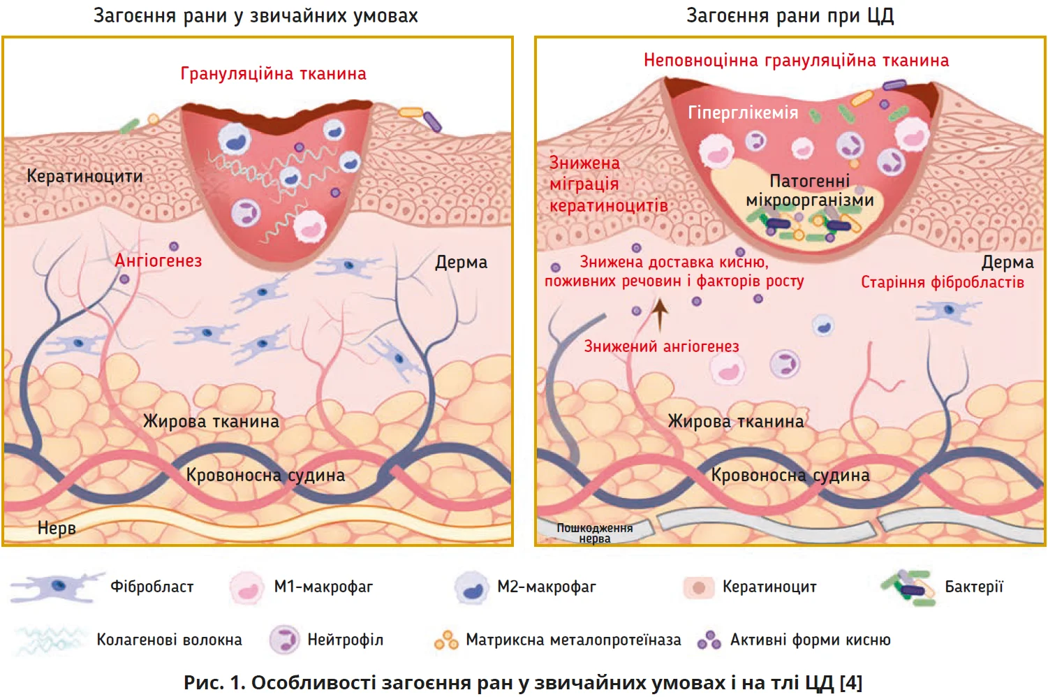 Загоєння будь-якої рани у хворих на ЦД має свої особливості. Якщо в типовій ситуації рана проходить послідовні етапи – гемостаз, запалення, проліферацію та ремоделювання (рис. 1), то при ЦД цей сценарій часто збивається вже на ранніх кроках [3]. Найуразливішою ланкою є фаза запалення: вона може затягуватися через персистивну гіперглікемію, оксидативний стрес, порушення мікроциркуляції, нейропатію, недостатній ангіогенез і високий ризик бактерійної контамінації [2, 4].