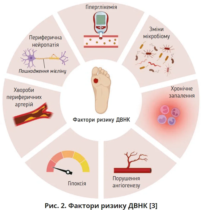 Саме ДВНК становлять істотну частку тягаря ускладнень: за даними літератури, з ними протягом життя стикається майже 7% хворих на ЦД 1-го та 2-го типів [11]. ДВНК істотно погіршують якість життя й асоціюються із частими та тривалими госпіталізаціями внаслідок інфікування, розвитку гангрени, необхідністю виконання ампутації [6] та збільшенням ризику смерті [8]. На практиці ведення таких пацієнтів залишається складним: рани часто загоюються повільно, рівень глікемії може бути далеким від цільового, а локальне мікросередовище виразки підтримує хронічне запалення й персистенцію інфекції.